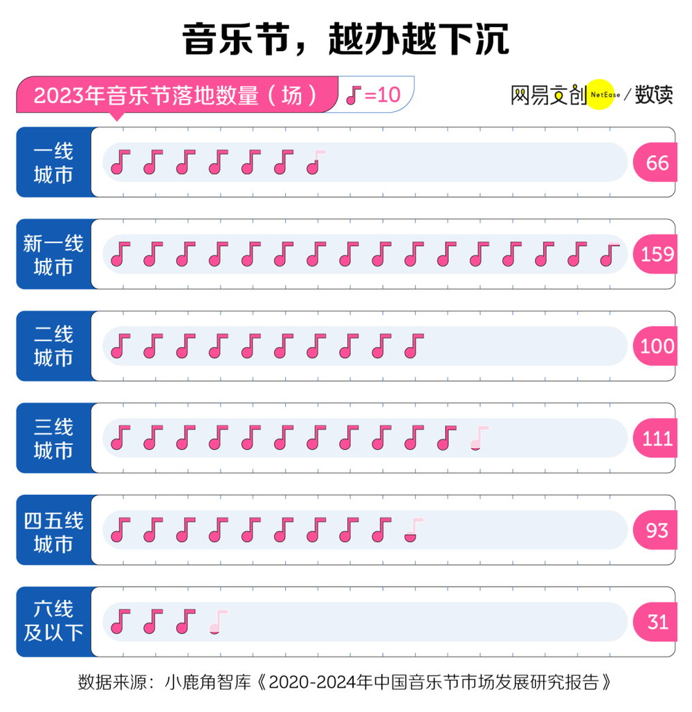 据小鹿角智库发布的《2020~2024 年中国音乐节市场发展研究报告》,在 2023 年举办的 560 场音乐节中,三线及以下城市举办音乐节 235 场,占比在四成,和一线及新一线城市音乐节数量旗鼓相当。